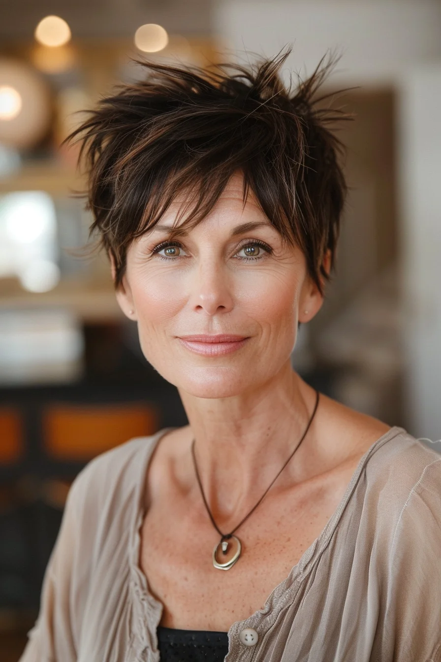 This edgy pixie cut features spiky, textured layers that add a dynamic and youthful flair.