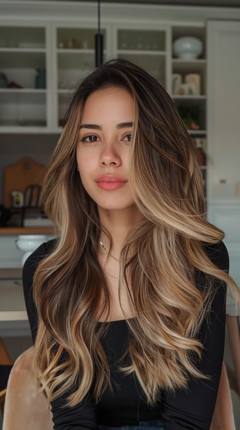 Showcasing a blend of dark brown and honey-blonde highlights, this hairstyle features long, flowing waves that exude elegance and sophistication.