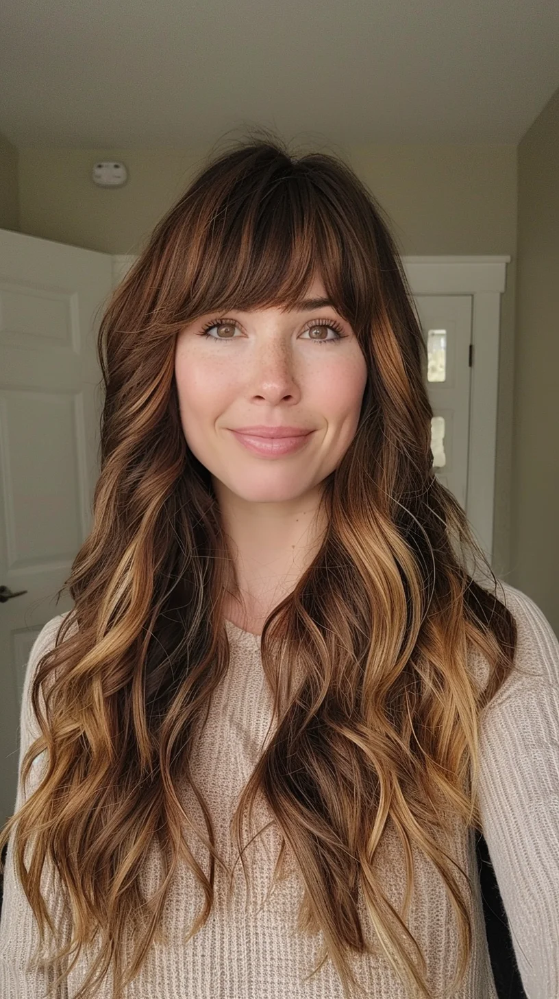 The long, flowing waves and curtain bangs give this style a glamorous yet relaxed vibe.