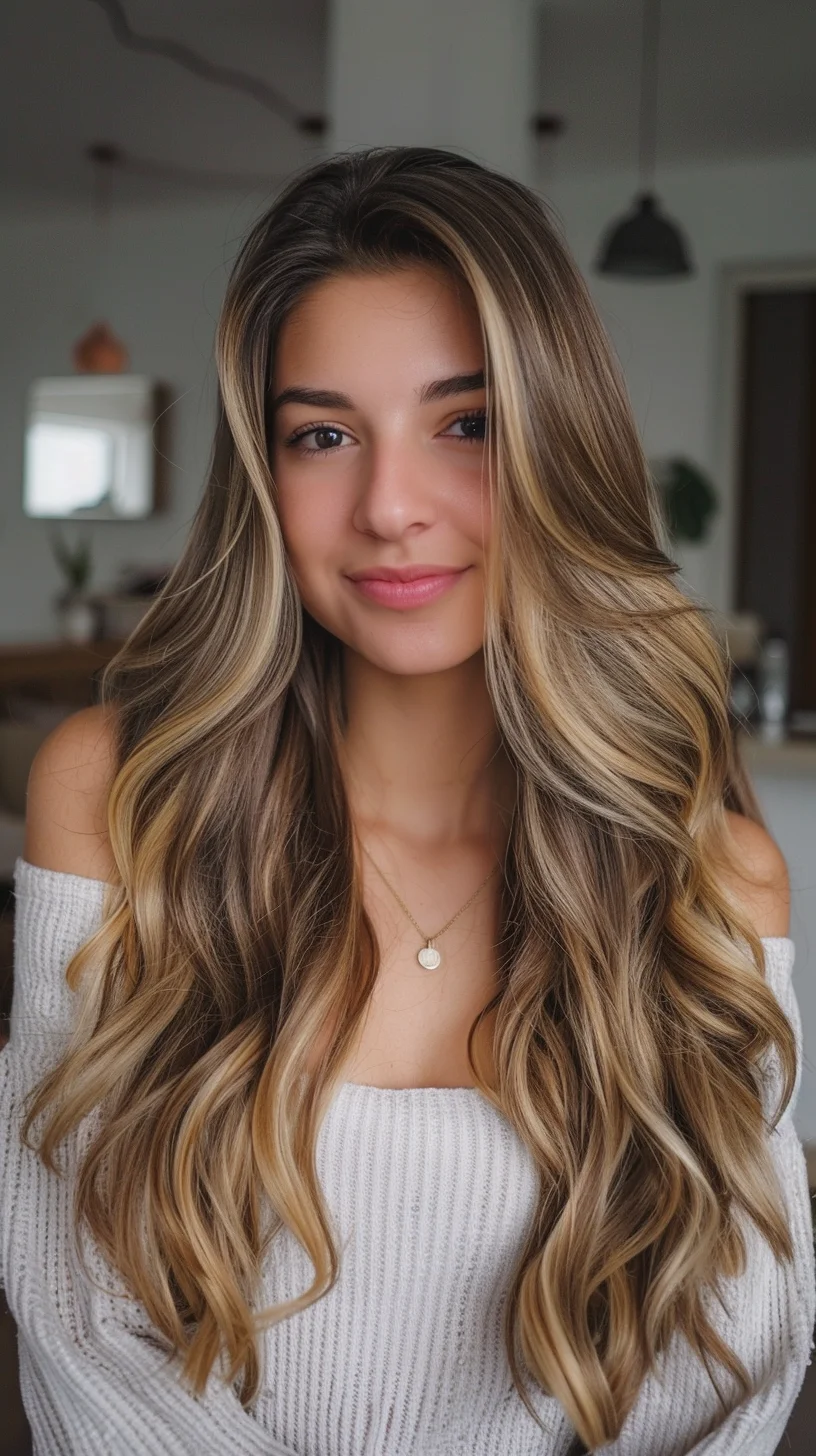 This hairstyle features long, voluminous waves with golden blonde highlights blended seamlessly into a rich brown base.