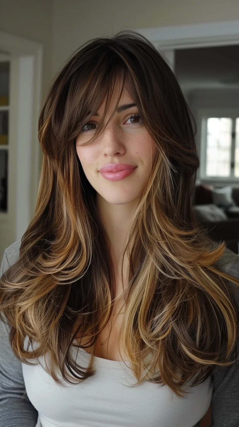 Featuring a blend of dark brown and caramel highlights, this hairstyle adds a radiant warmth.
