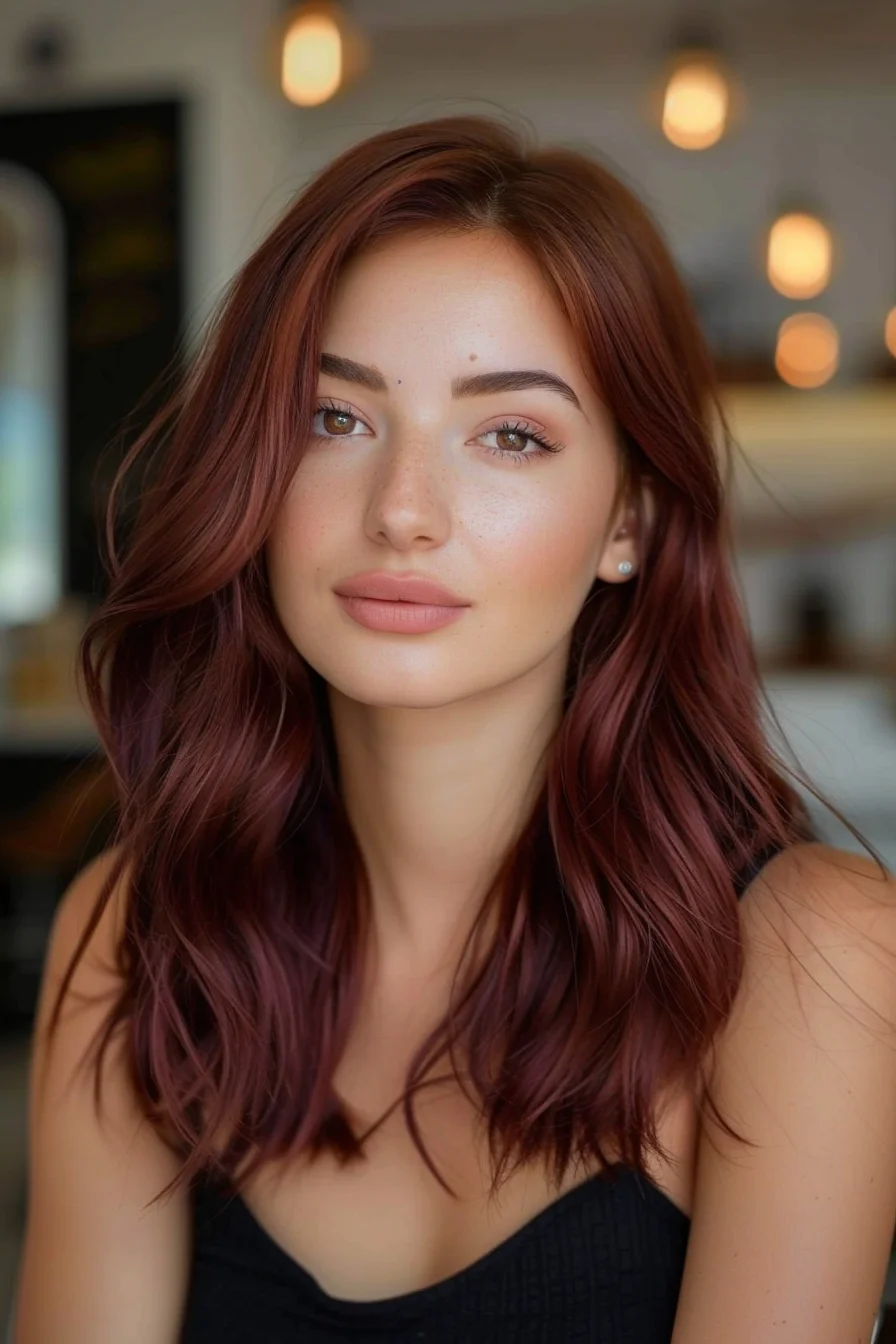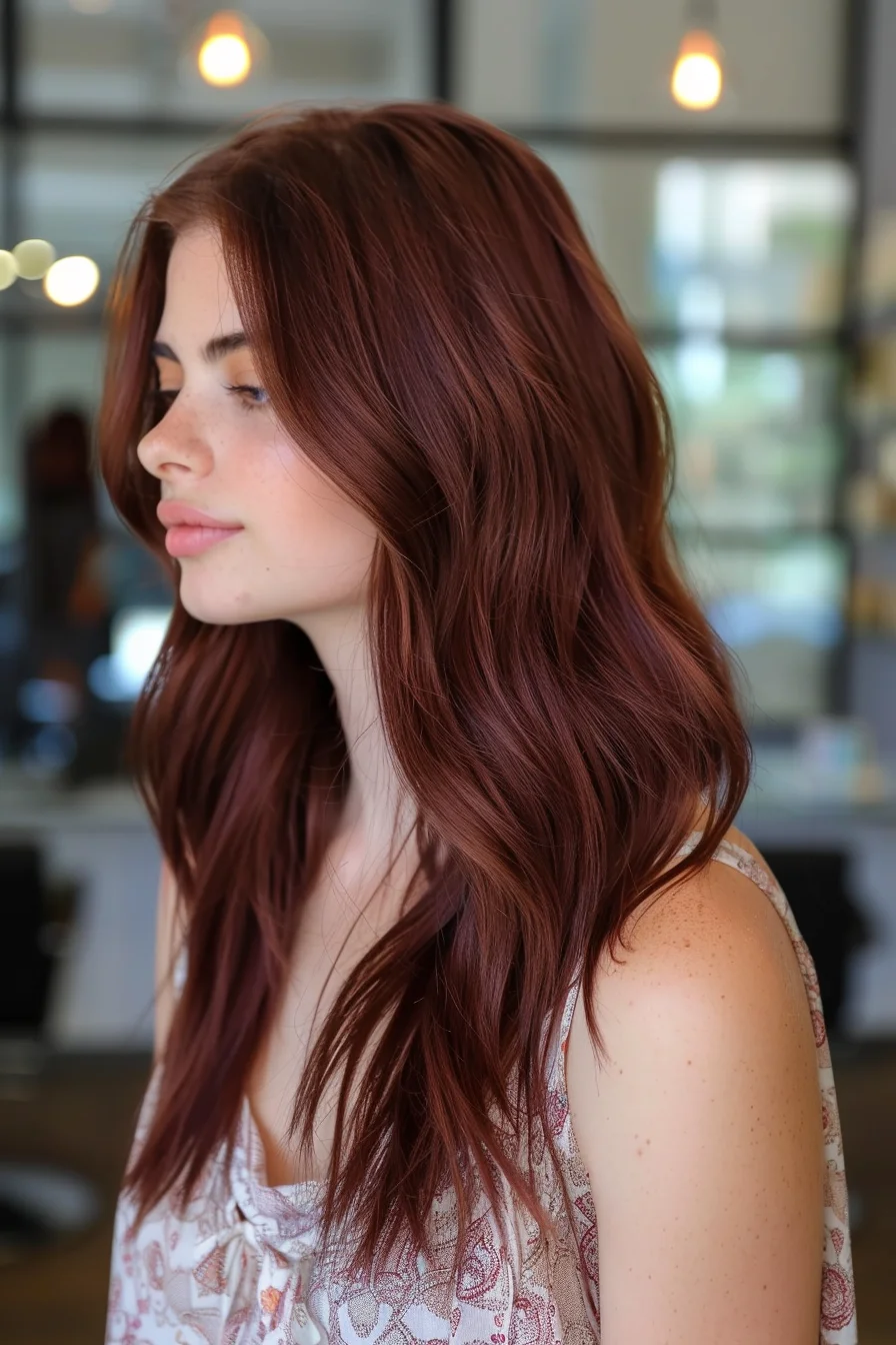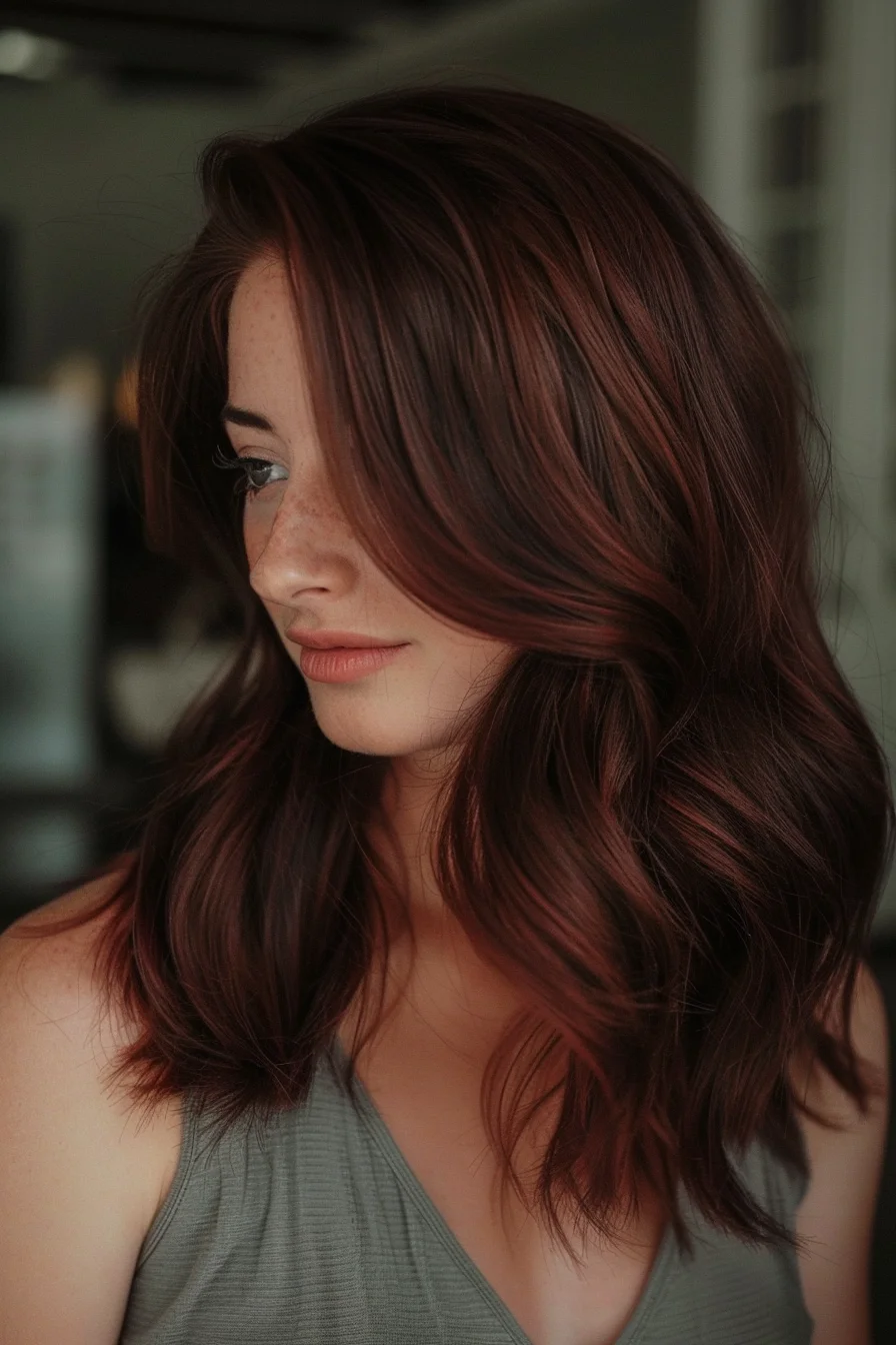 Deep cherry brown hair with soft, flowing waves.