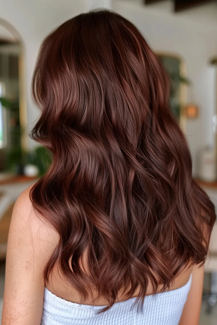 Rich, deep cherry brown hair with soft, flowing waves.
