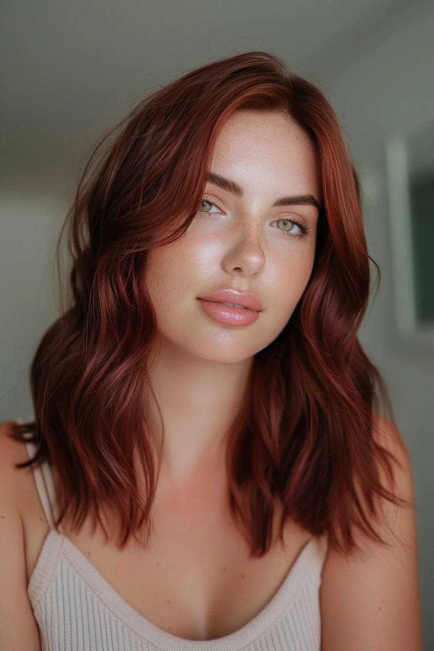 Medium-length hair styled in soft, tousled waves, featuring a rich, warm cherry brown color.