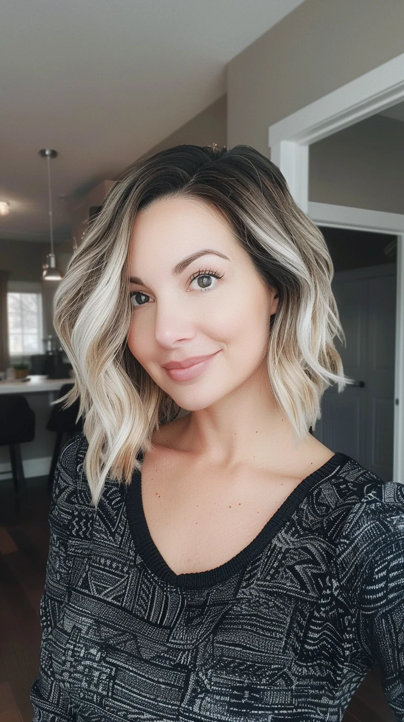 The hair color transitions from a dark base to a bright, platinum blonde, creating a striking contrast that adds depth and dimension to the look.