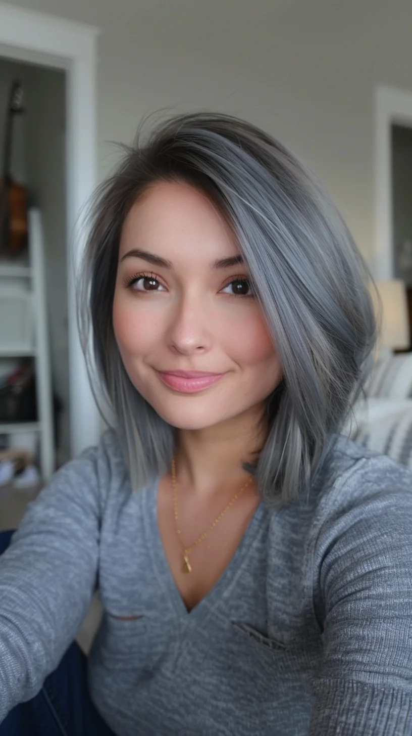 The cool, silver-gray color adds a modern, sophisticated vibe, giving the hairstyle an elegant, polished finish.