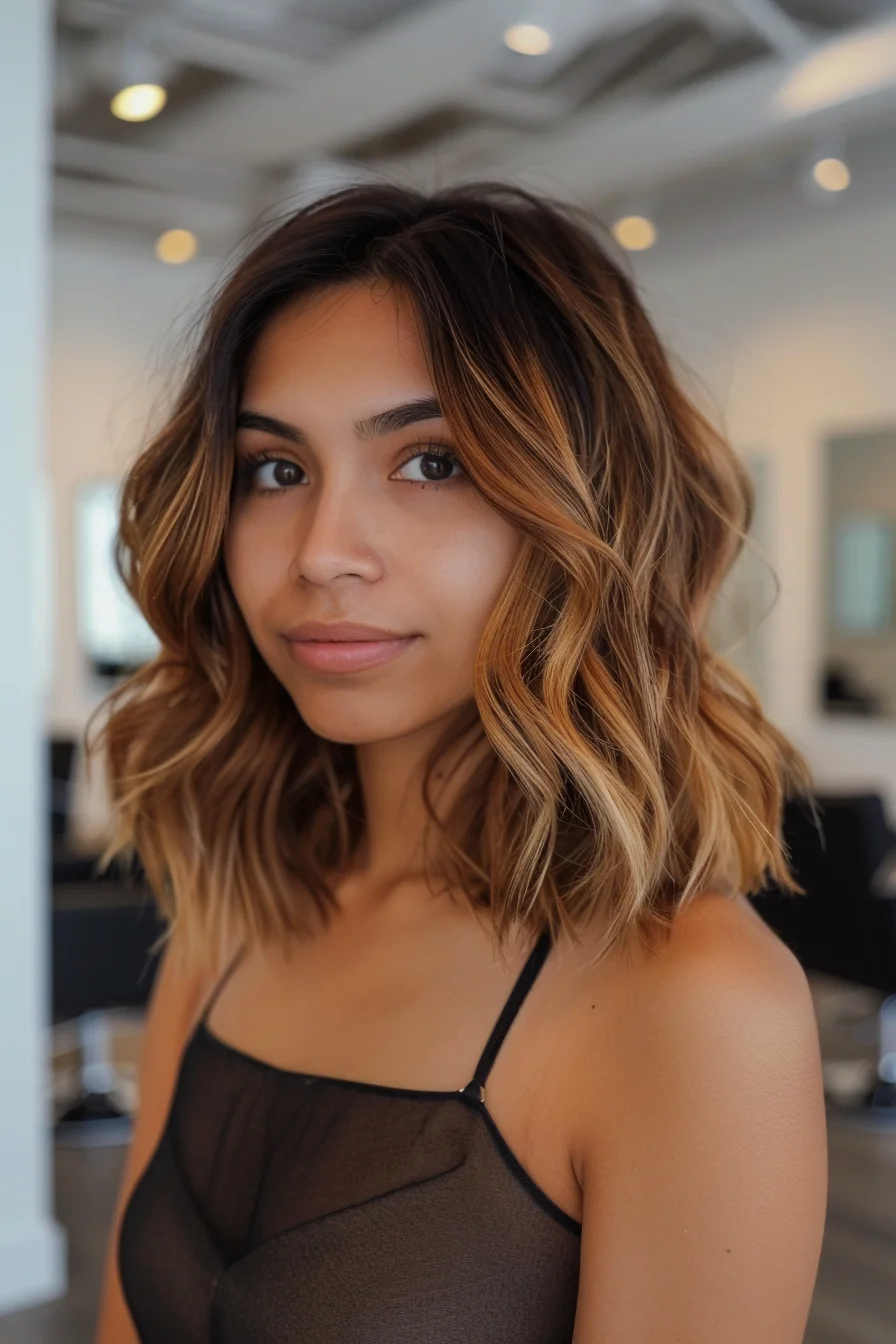 Warm caramel balayage brightens this wavy lob, blending seamlessly into a rich, chocolate brown base.