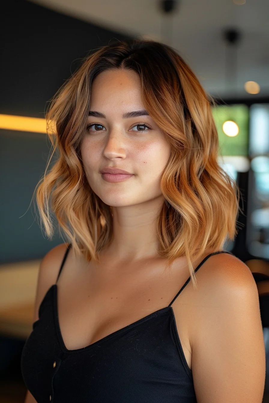 Soft, golden balayage enhances this wavy, mid-length bob with a sunlit glow.