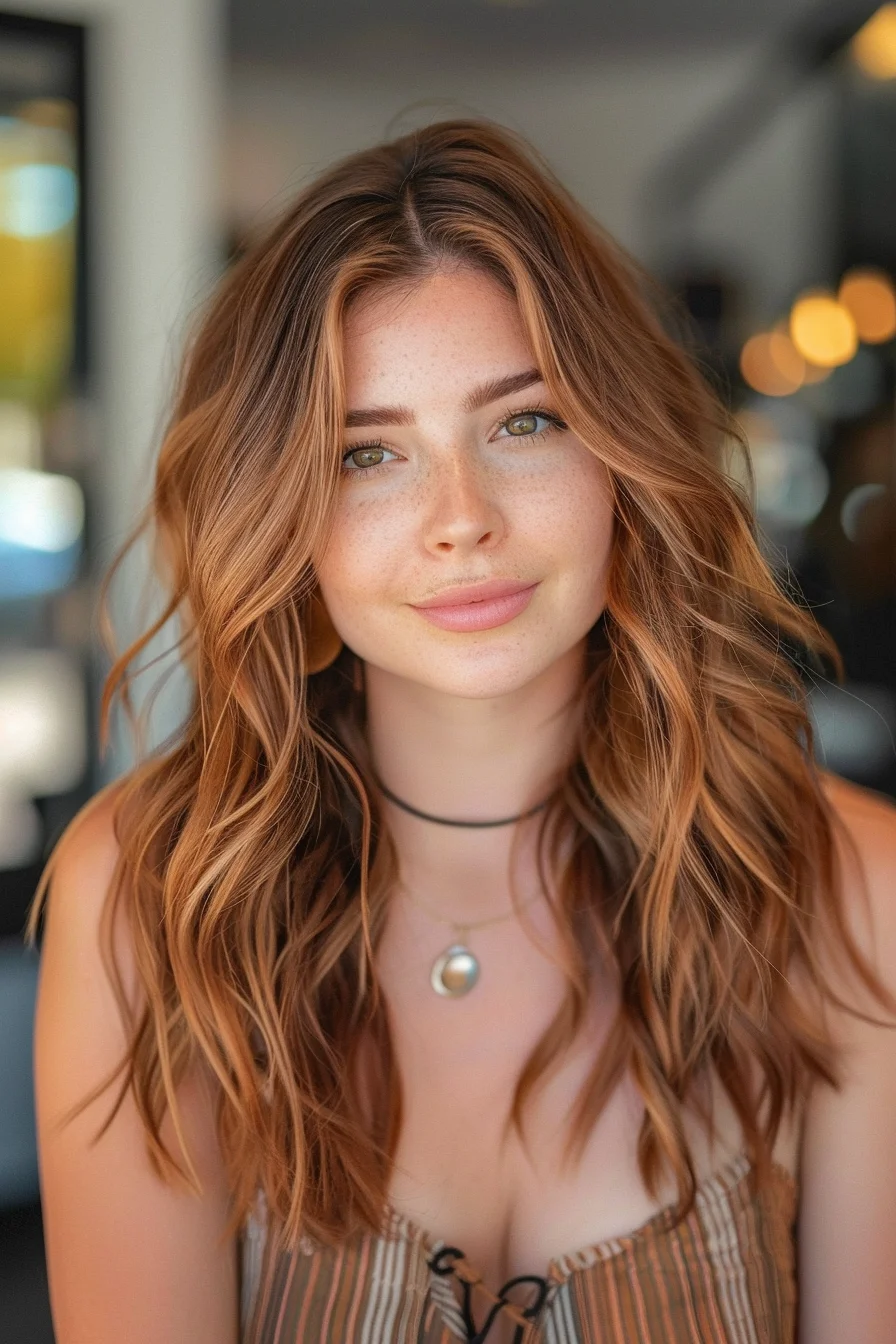 Subtle cinnamon tones bring a warm, reddish glow to this flowing, wavy hairstyle.