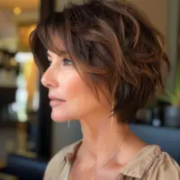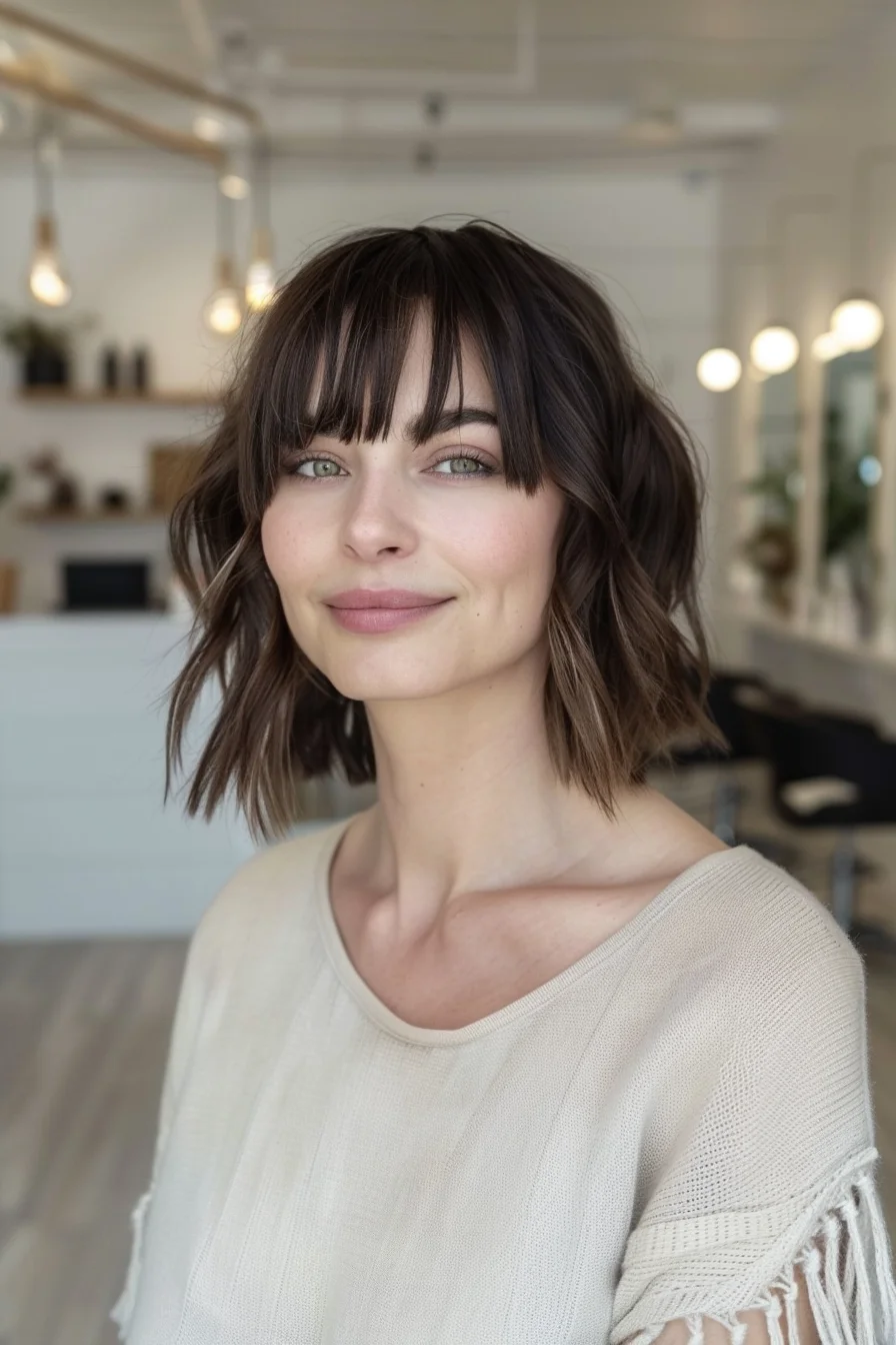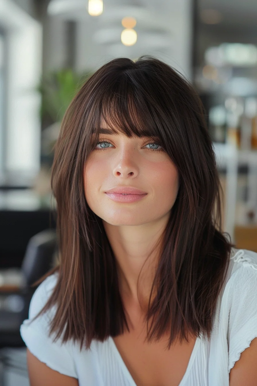 The richness of dark brown shades paired with the versatility of bangs creates a polished look that’s effortlessly on-trend.