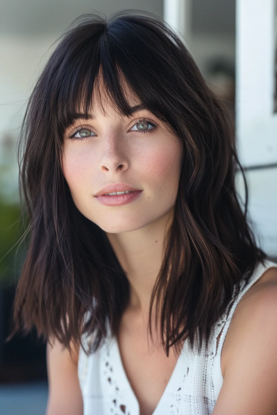 Mid-length layers in a sumptuous dark brown shade frame the face beautifully, with feathered bangs that sweep to the side with casual grace.