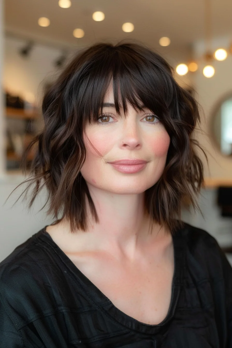 Dark brown hair with bangs is making a statement this season, offering a sleek and stylish way to elevate any haircut.
