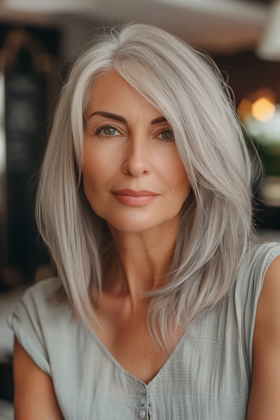 Flowing mid-length layers showcase brilliant silver tones that capture light beautifully.