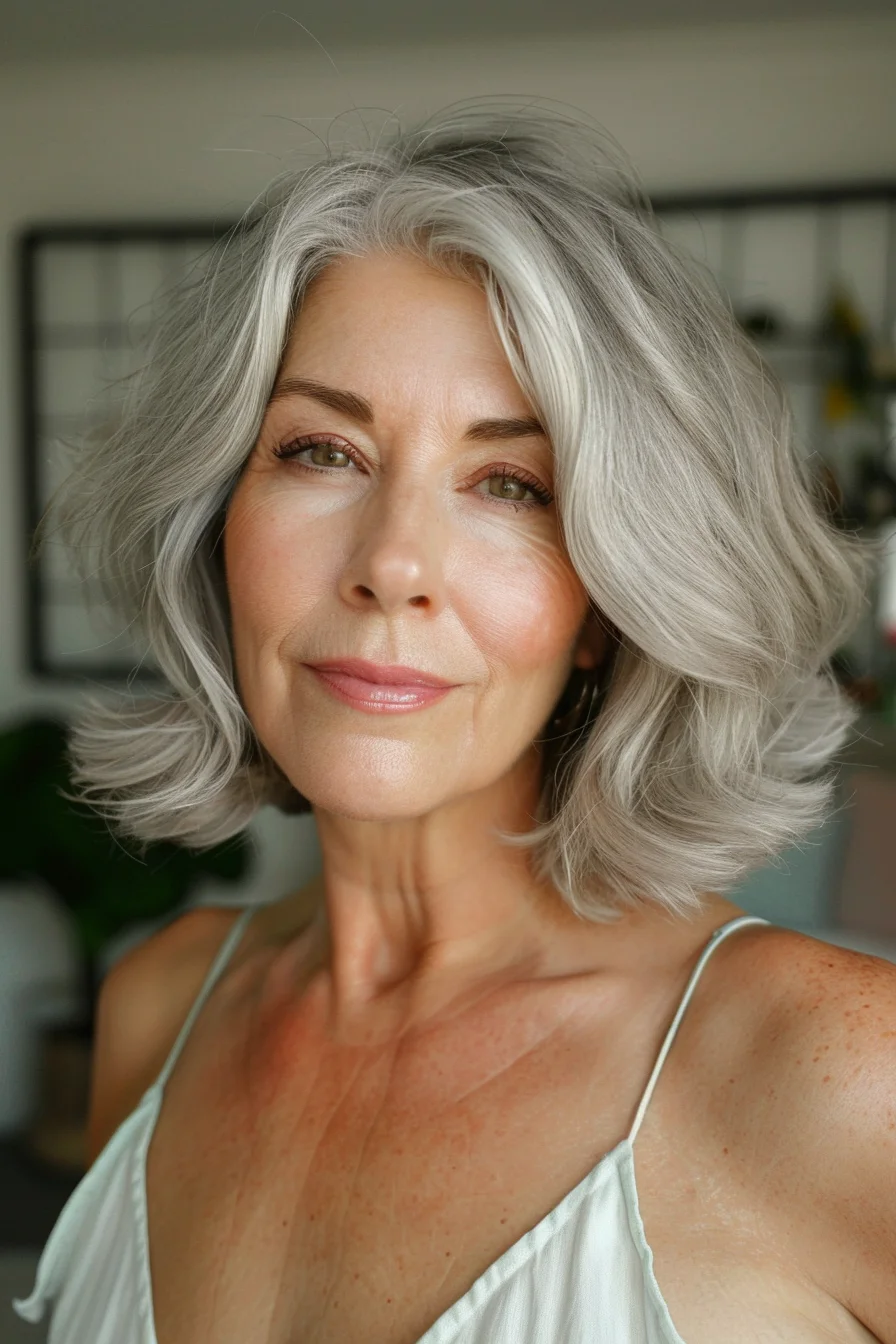 Medium-length silver bob with gentle waves hits right at the collarbone, showcasing dimensional tones of ash and pearl.
