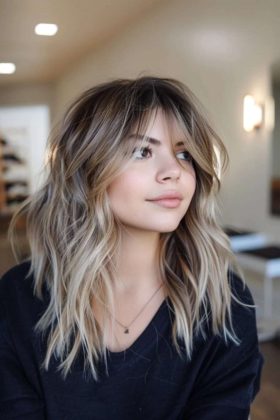 Shoulder-length shag with rich layers and dimensional balayage flowing from dark roots to golden ends.