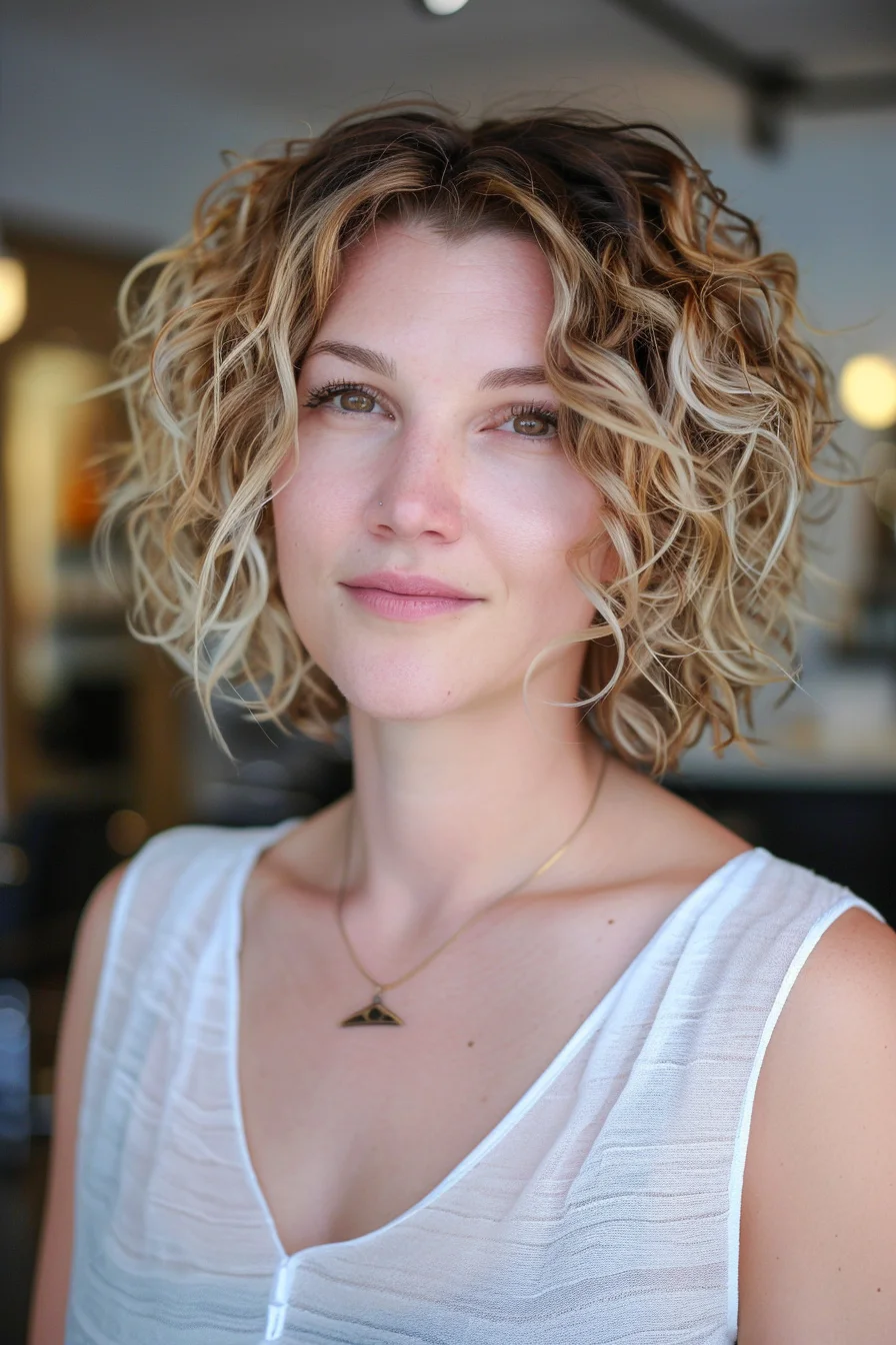 Sun-kissed blonde curls styled in a breezy bob highlight a beautiful blend of warm and cool tones.