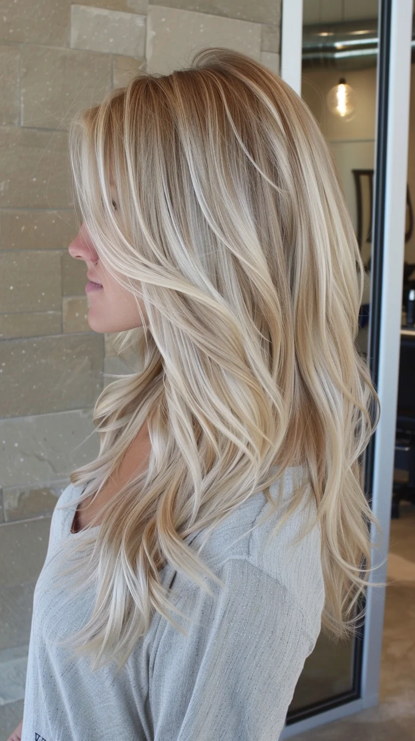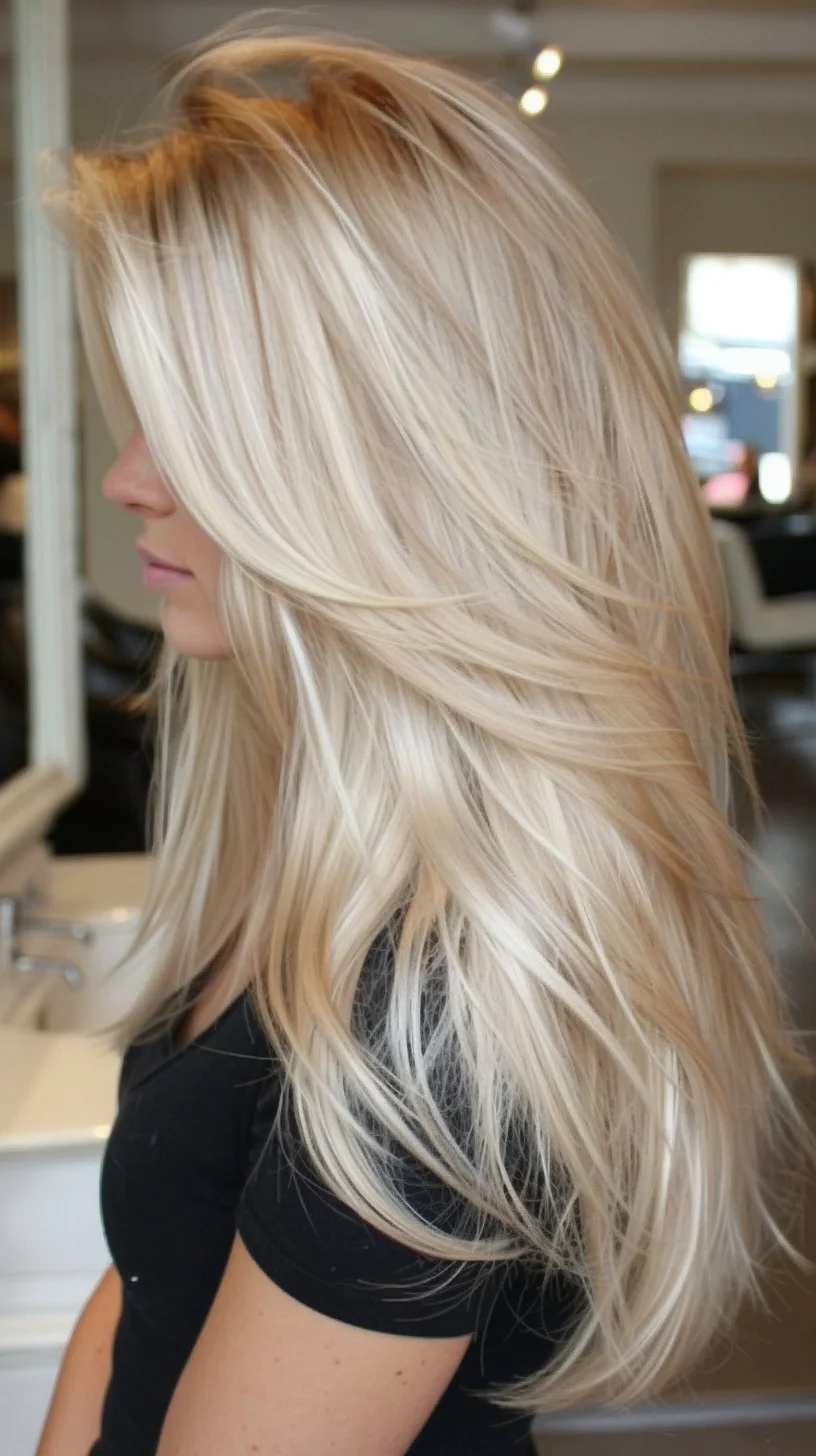 Long layered champagne blonde hair viewed from the side reveals expert color work with root shadowing that transitions into bright blonde lengths.
