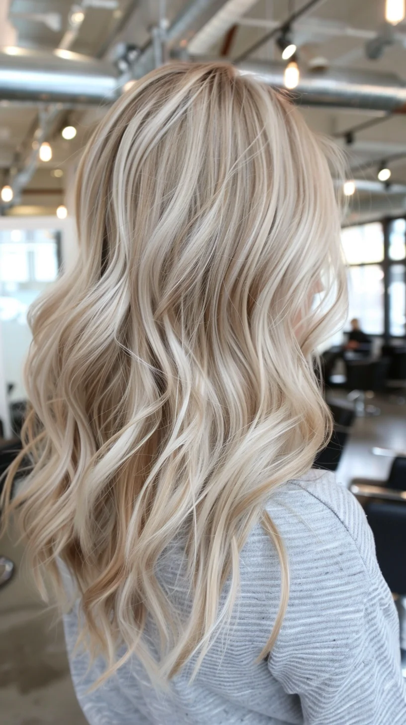 Long champagne blonde hair with shadow roots features beautifully blended balayage and gentle waves throughout.